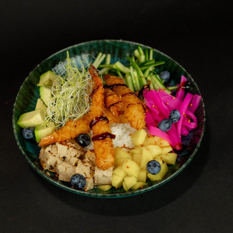 Ryz, krewetki w tempurze, awokado, ogórek, tamago, mango, daikon, dressing, sos sojowy, sezam
