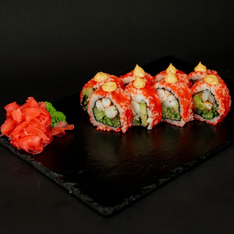 Ryż, nori, krewetka, masago albo sezam , ogórek, spicy, awokado