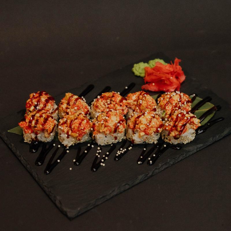 Ryż, nori, Philadelphia, mieszanka z kurczakiem, masago, ogórek, sezam, teriyaki