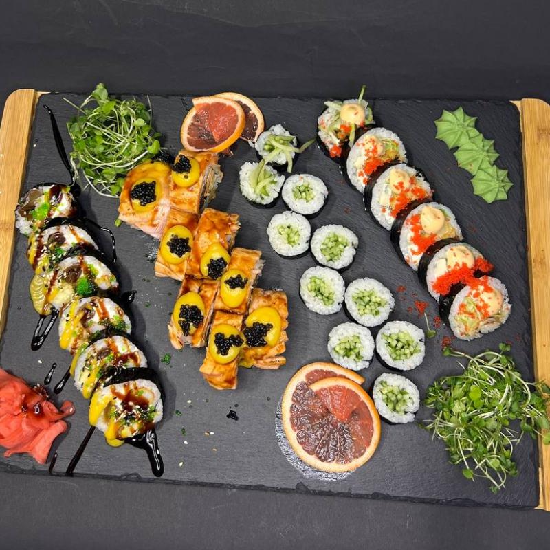 Karmelowy Krzyk z krewetką w tempurze x 6, Brie zmowy z węgorzem x 6, Zombie Flame Salamon x 8, Hosomaki z ogórkiem x 10