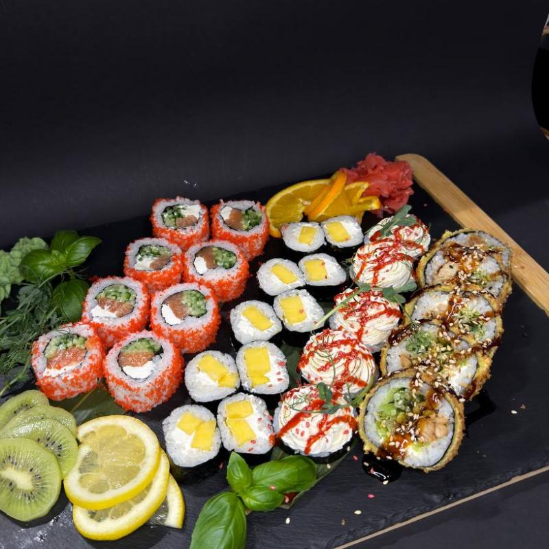 Philadelphia w masago x 8, Tempura z kurczakiem x 5, Fusion spicy grill x 5, Hosomaki serek-mango x 10
