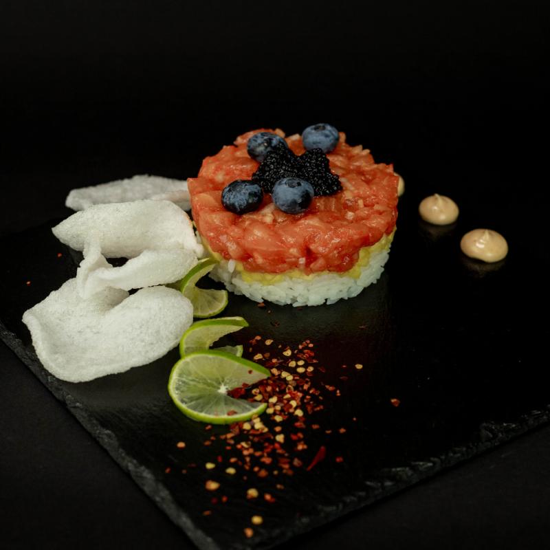 Łosoś, cebula, sos sojowy, mango, ryż, sos sriracha, chipsy krewetkowe