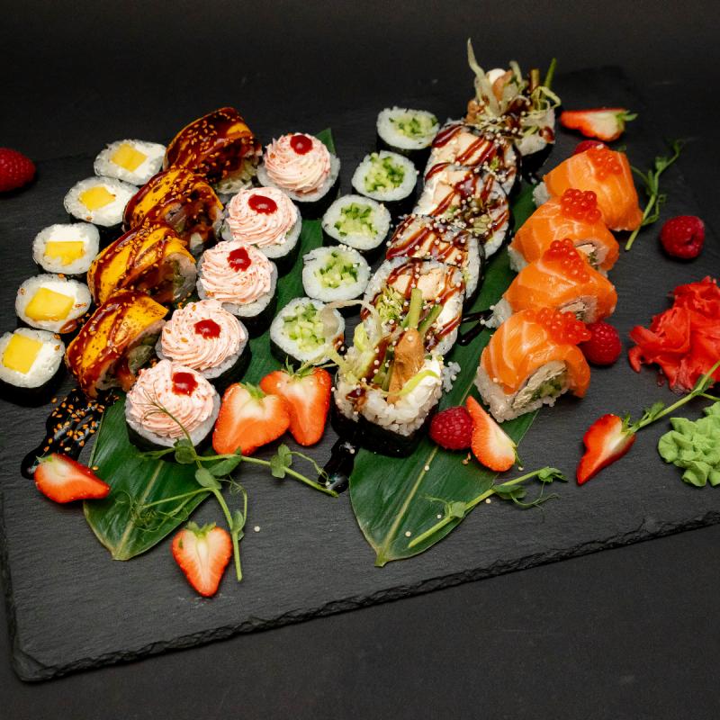 Phila klasyczna x 4, Fusion Cheese roll x 4, Futomaki z kurczakiem x 6, Spicy łosoś x 5, Hosomaki serek- mango x 5, Hosomaki ogórek x 5