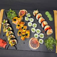 Futomaki kurczak 5 szt, Futomaki z krewetką w tempurze 5 szt, Phila łosoś 4 szt, Phila z tuńczykiem wędzonym 4 szt, Hosomaki z serek mango 8 szt, Hosomaki ogórek 4 szt