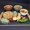 Zupa, sajgonki z łosośiem grill, temari z krewetką, salatka